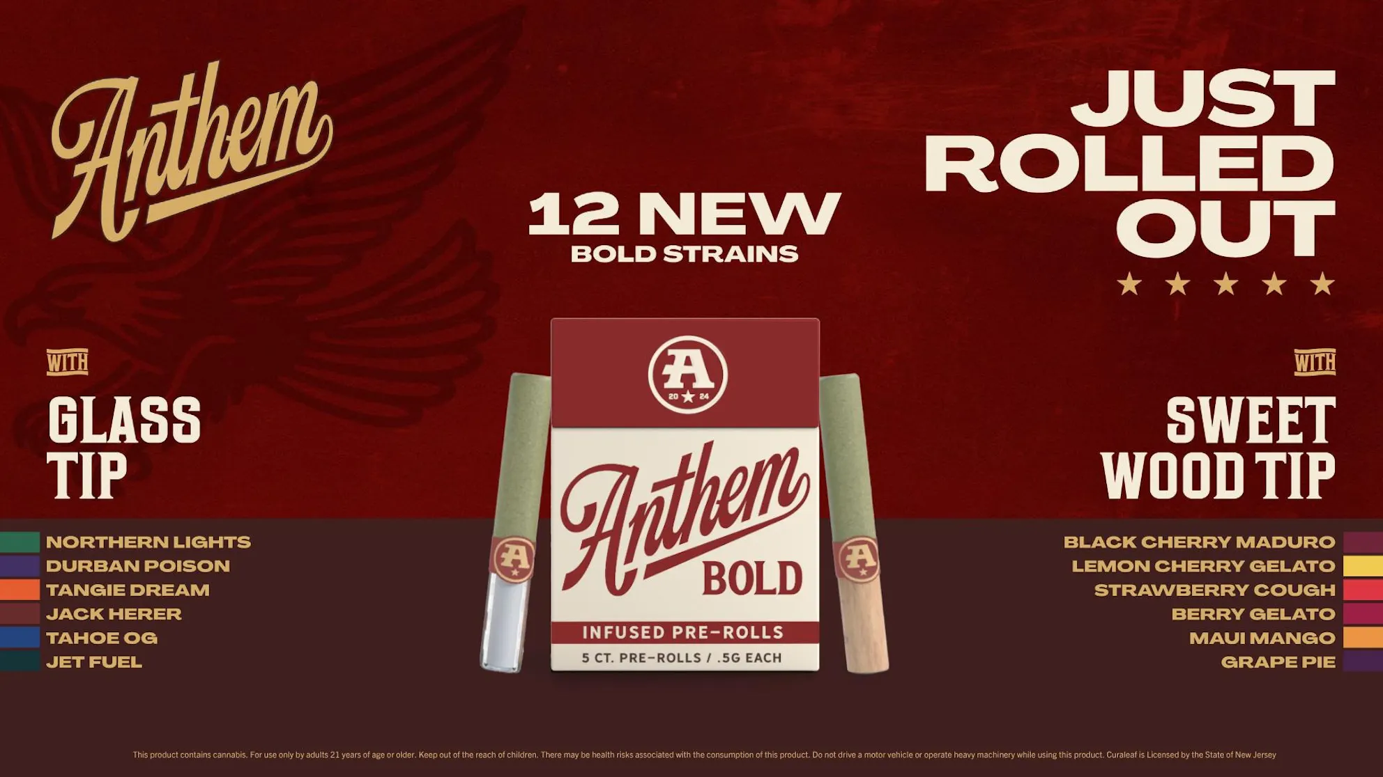 Inspired by classic brands from the past, Anthem is the next great American icon. More than a joint, Anthems pre-rolls look different, feel different, and hit different. They're uniquely designed with a cylindrical style and a flip-top box that grabs attention and get people talking. This attention to detail is matched with a high-quality blend of American-grown cannabis strains curated for their consistent sativa, indica, or hybrid effects and everyday use. They're American grown and made the way things used to be made, in state-of-the-art facilities by true cannabis craftspeople who take pride in what they grow. A modern take on classic traditions, Anthem is here to let the good times roll.