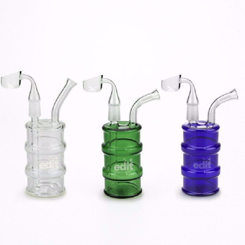 This Oil Drum Dab Rig from our very own EDIT Collection is a funky and functional piece of glass work. The cylindrical shape mirrors the look of a real life oil barrel, and is available in different glass colors. The 14mm male ground joint is topped off with a 14mm female quartz banger, and the frosted EDIT logo finishes the piece.