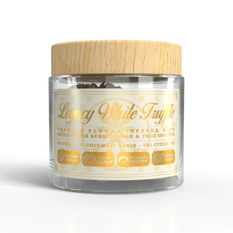 Legacy White Truffle -Premium Indoor Flower - Coated With Solventless Bubble Hash + THCA Isolate - LEGACY - Grown In The Columbia Basin- Proudly Produced In Tri Cites WA - Est. 2015 - Handcrafted - Artisanal Cannabis - Sustainable Methods - Single Source - Smoke Clean; Hayaa Green