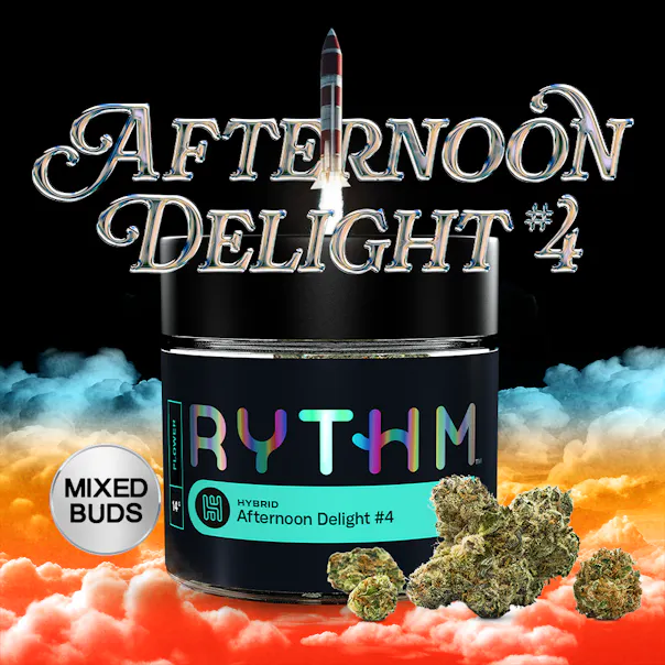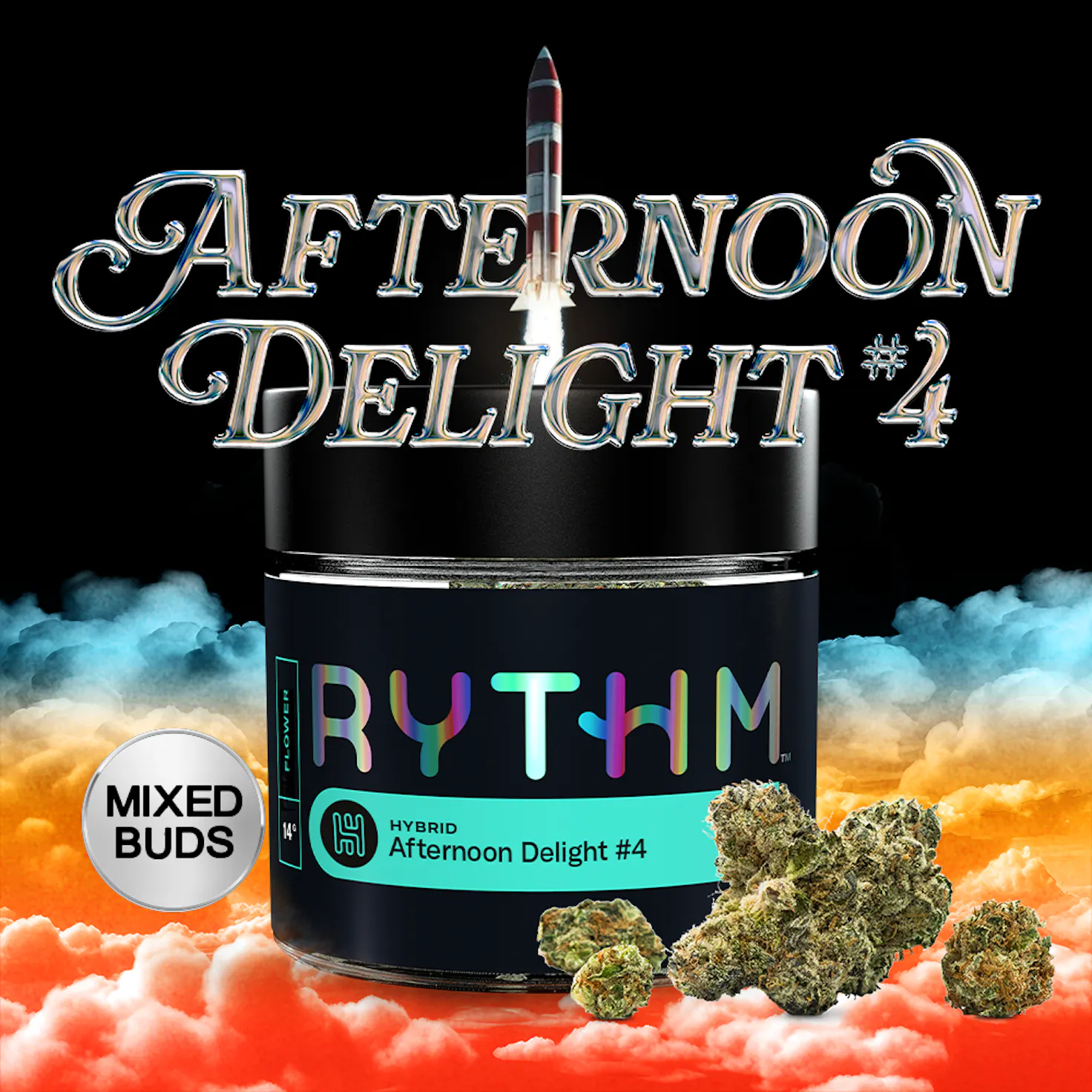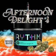 Afternoon Delight #4 [orig: GMO x Trophy Wife], a RYTHM Icon Strain, is a hybrid with sharp diesel aroma, earthy depth, and savory funk throughout.