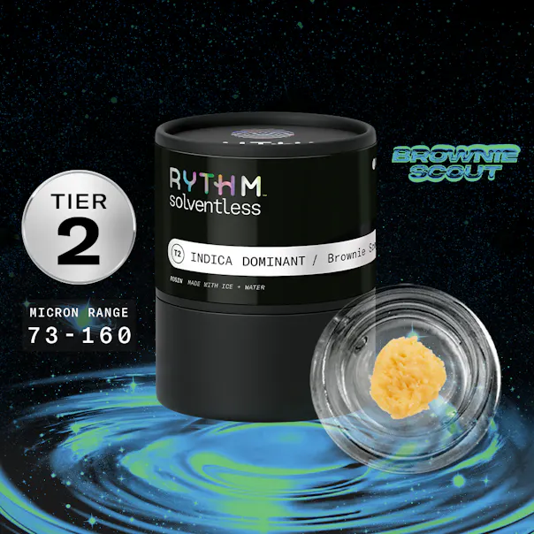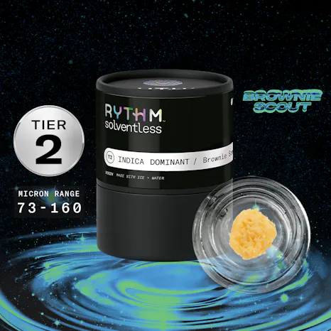 Brownie Scout, a GTI Original and a RYTHM Icon Strain, is a decadent indica with dense chocolatey richness, nutty spice, and thick layers of earthy sweetness.