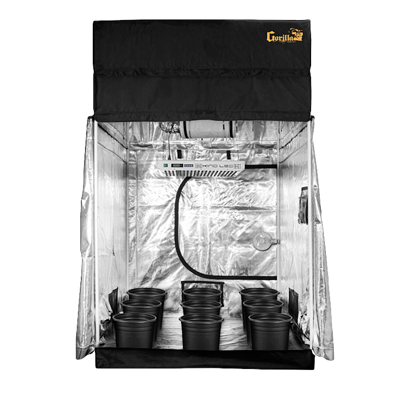 The SuperRoom 5′ x 5′ LED Soil Grow Room Package includes a 5′ x 5′ Gorilla Grow Tent; a Kind LED K5-XL750 grow light; Nine 5 gallon soil pots; timers for complete light cycle automation; a Phresh carbon scrubber & filter; digital readout thermometer / hygrometer; an internal circulation fan; an adjustable net trellis system; an electrical GFCI adapter; a pH Testing Kit; a TDS Meter;a TechnaFlora Nutrient Bundle; an instructional DVD and a 3 year warranty!