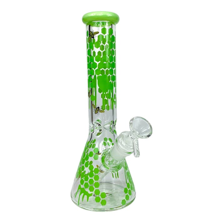 Phoenix Honeycomb Glass Beaker Bong Green 25cm The Phoenix Honeycomb Glass Beaker Bong in green features a vibrant honeycomb and dripping honey design, complete with detailed bee accents. Standing at 25cm, this bong is crafted from durable 5mm thick gl...