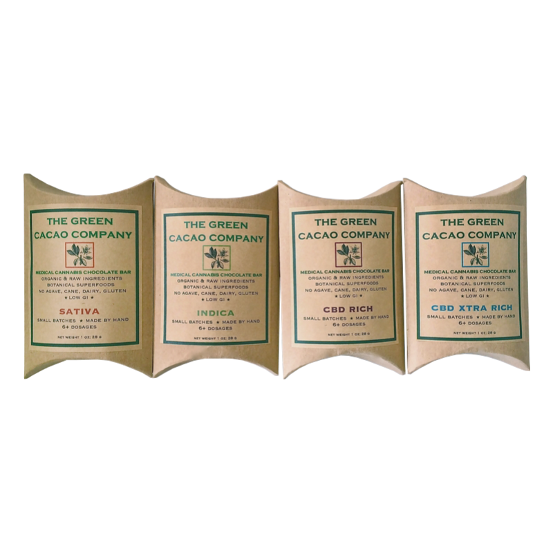The Green Cacao Company specializes in high end cannabis raw chocolates made almost entirely with organically grown and 'superfood' (nutrient dense) ingredients with a low glycemic index (safe for diabetics). In addition to the cannabis, the raw cacao they use has a structure that mimics cannabinoids and creates results similar to a sativa (which can trigger a significant release of seratonin, dopamine, and endorphin). Green Cacao chocolates are made with a number of nutritional super foods to make this one amazing experience even without the cannabis! The chocolates are agave, sugar, dairy, and gluten-free. Raw cacao is perishable and best stored in a refrigerator; move them to a freezer after the sell-by date. We recommend leaving out for an hour or two before eating, as they taste best at room temperature! The chocolate is made in small bars, easily breakable into six pieces. Varities include: Indica & Sativa bars with 90mg THC, CBD-rich 2:1 bars with 30mg CBD / 15mg THC , and CBD X-TRA rich 12:1 Bars contain 60mg CBD / 5mg THC.