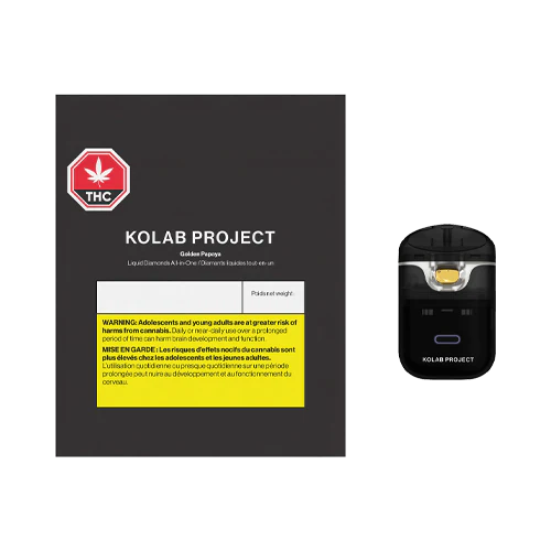 Kolab Project's proprietary AIO vape combines state-of-the-art technology with novel and convenient design. Kolab's device is rechargeable, uses a blue ceramic coil, and offers dual-heat settings to guarantee a carefully crafted experience. White Grape Diamonds AIO uses a hydrocarbon-extracted liquid diamonds base to achieve a THC potency of 92-98%, with a light grape and floral finish on the exhale. Embrace the unexpected with Kolab Project.