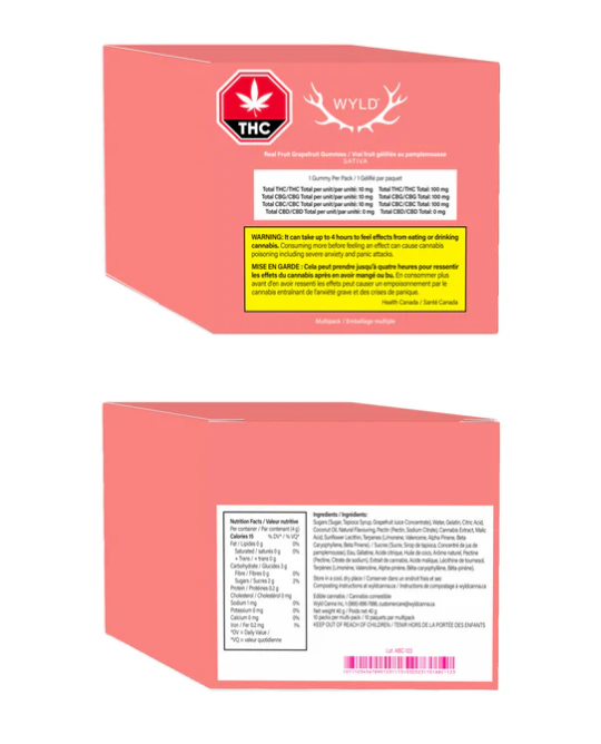Wyld Grapefruit sativa-dominant THC:CBG:CBC gummies are a 1:1:1 product, made using real fruit, botanical terpenes and natural flavours. Each gummy contains 10mg THC, 10mg CBG and 10mg CBC, for a total of 100mg THC, 100mg CBG and 100mg CBC per pack. All Wyld gummies are in compostable pouches and provide consistent experiences. Each Wyld Grapefruit gummy contains 10mg THC, 10mg CBG, and 10mg CBC combined with the terpenes limonene, valencene, beta-caryophyllene, alpha-pinene, and beta-pinene.