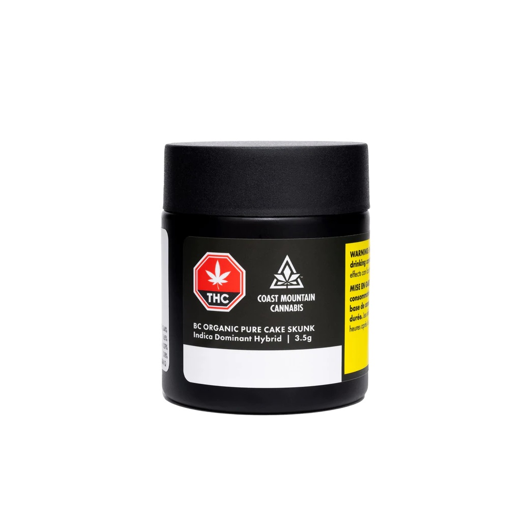 THC: 26.00 - 32.00% CBD: 0.00 - 0.10% -- High-THC, indica-dominant , certified organic flower (PACS), grown indoors in BC in organic living soil without the use of artificial pesticides or chemical fertilizers. Flowers are dried using a slow cold cure, before being carefully hand-trimmed and packed in glass jars. The strong lineage of Pure Cake Skunk is from Layer Cake and the forefathers of Super Skunk Haze. The dominant terpenes are myrcene, beta-caryophyllene, and linalool.
