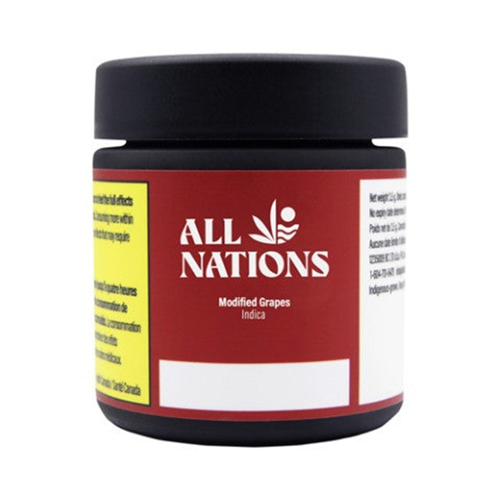 THC: 25.00 - 31.00% CBD: 0.01 - 0.10% -- Modified Grapes is a cross between the award-winning genetics GMO and Purple Punch. This strain has a deep purple colouration, a frosty coating of trichomes, and aromas of fruit, berries, and diesel. Top terpenes include Limonene, Beta-Caryophyllene, and Beta-Pinene. Produced on Stó:lo traditional territory, weaving Indigenous values with craft cultivation methods.