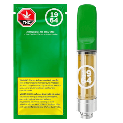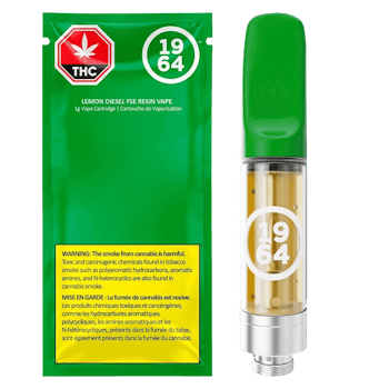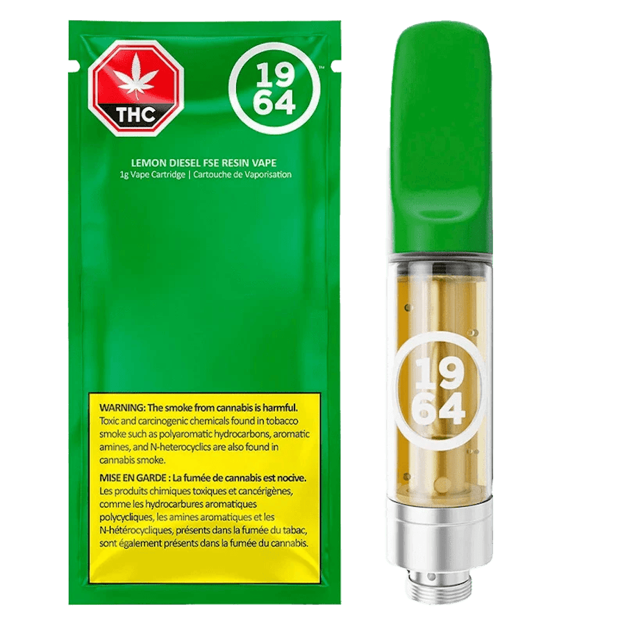 Sativa-dominant, cured-resin cart with notes of zesty lemon with earthy undertones. Introducing Lemon Diesel FSE RESIN VAPE – the second cured resin sativa vape from 1964. Lemon Diesel brings an invigorating citrus twist, combining bright-lemon zest with subtle earthy undertones. Its aroma is fresh and punchy, mingling notes of citrus with a hint of vanilla for a balanced, vibrant profile.