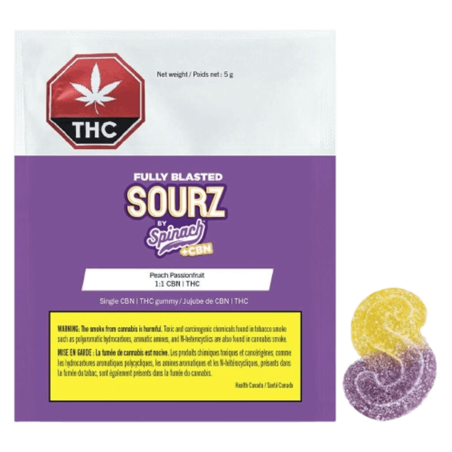 Dual-flavoured, peach-passionfruit gummy with 10mg THC and 10mg CBN. Prepare for your tastebuds to blast off. SOURZ by Spinach Fully Blasted Peach Passionfruit 1:1 CBN | THC gummies feature a combination of luscious peach and tart passionfruit flavours. With a balanced blend of 10mg THC and 10mg CBN per piece. This dual-flavoured gummy is over-the-top with natural flavours and blasted with sour crystals. Enjoy one gummy per pack, 10mg THC total and 10mg CBN total.