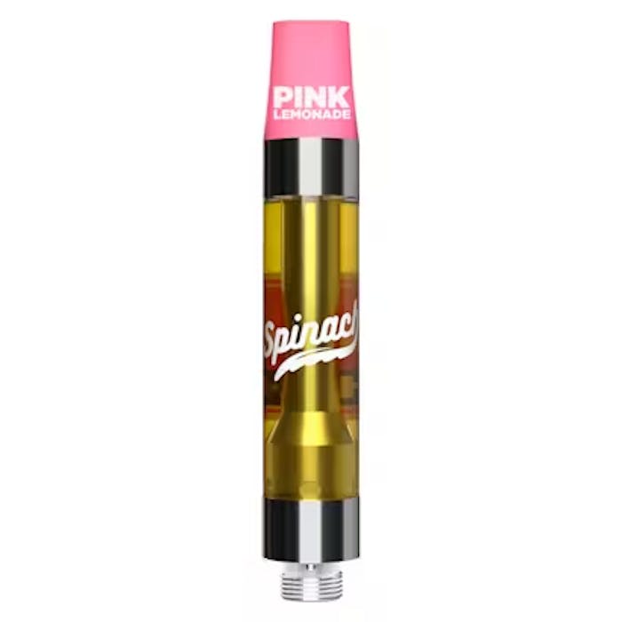 1.2g sativa-dominant vape full of sweet raspberry and lemonade flavour with 1000mg THC. Get that summertime, thirst-quenching flavour in one delicious vape. Inspired by the strain Pink Lemonade, which has a Lemon Skunk and Purple Kush lineage, this vape is full of sweet raspberry and refreshing lemonade flavour notes. With some of the finest cannabis extract and aerosol-tested vape carts, Spinach leveled up the potency with 1000mg THC per cart. Which means bigger hits and bigger flavour.