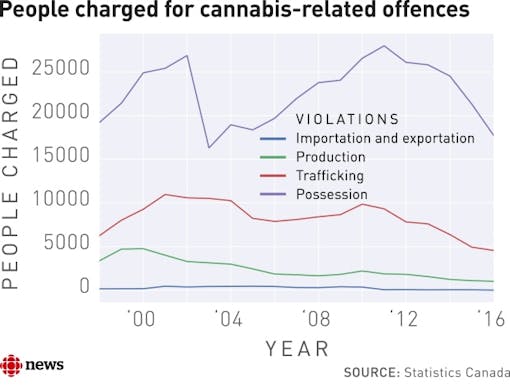 There were 17,700 people older than 12 charged in Canada in 2016 for a cannabis-related crime, according to police data released by Statistics Canada. That number was down considerably from 2015, when police charged 21,300 people.