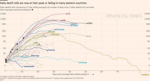 Better, thanks to state-mandated stay-at-home orders. On April 20, America’s coronavirus death toll surpassed 40,000, although the outbreak shows signs of leveling off after nearly 40 straight days of growth. Check out the United States’s trajectory on the April 20 Financial Times chart: