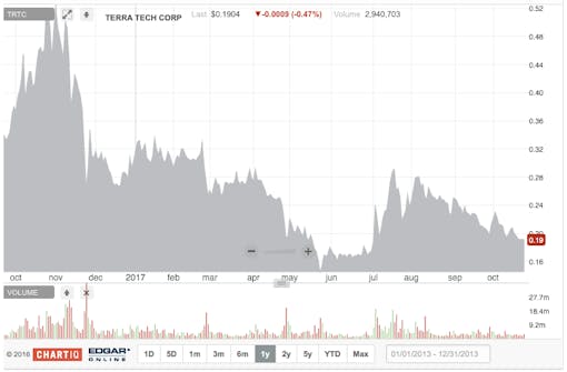 Most cannabis investors are familiar with Terra Tech. It’s currently trading at $0.19 per share, with about 850 million shares outstanding on a fully diluted basis. The company has a market capitalization of $160 million and expects to generate cannabis sales of $30 million or so in 2017. Here’s what TRTC’s recent history looks like: