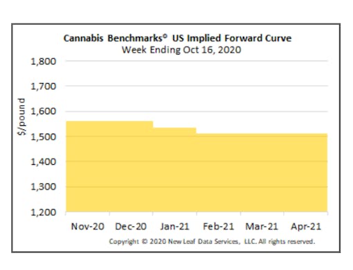 The cost of the average wholesale pound in the US is expected to decline trivially this fall from $1,550 to $1,510—$40 bucks, stated Cannabis Benchmarks.