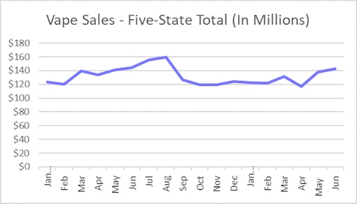 In a study of five legal states, the Colorado-based cannabis data firm BDS Analytics found vape sales peaked at $160 million a month in July 2019, and then fell to $126 million by October 2019.