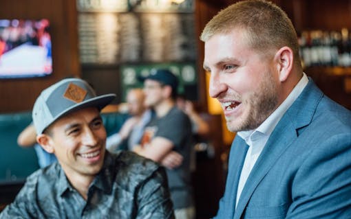 Nate Gibbs of Gold Leaf Gardens and Diego Pellicer owner Alejandro Canto are understandably jovial following the sale of the $10,000 “El Dorado” cannagar, June 18, 2018 in Seattle. (Grant Hindsley for Leafly)