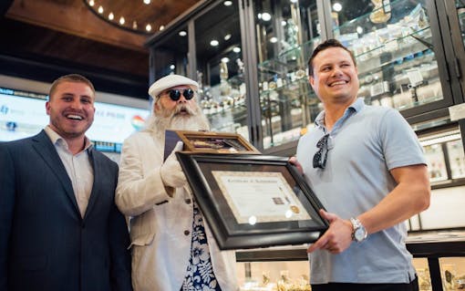 Justin Costello stands with an official certificate after purchasing a $10,000 weed cigar wrapped in 24k gold leaf at Diego Pellicer on Monday, June 18, 2018 in Seattle. (Grant Hindsley for Leafly)