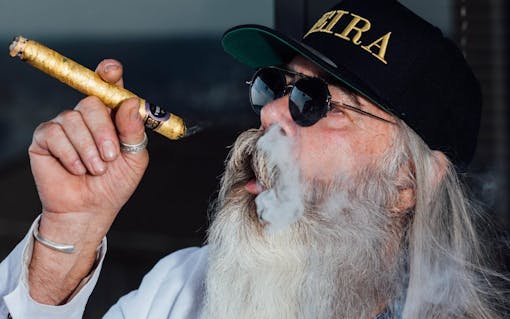 Seattle cannabis scene icon Jake the Professor takes a puff of a $10,000 cannagar on Monday, June 18, 2018 in Seattle. (Grant Hindsley for Lealfy)