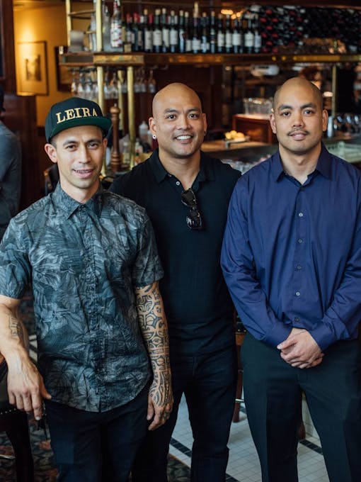 The magical men behind “El Dorado” from left to right: Nate Gibbs, owner and grower at Gold Leaf Gardens; brothers Ariel and Brian Payopay of Leira Cannagar. Monday, June 18, 2018 in Seattle. (Grant Hindsley for Leafly)