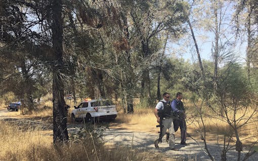 Officers search for a suspect after a shooting at a Sugarleaf-affiliated cannabis grow in Yuba County, Calif., on Aug. 1, 2017. Two sheriff’s deputies were shot and wounded after they responded to reports of an armed and agitated man pulling up plants. (AP Photo/Sophia Bollag)