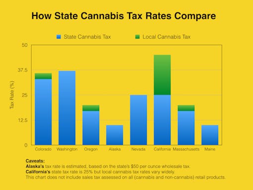 Under Prop 64, hitting that 18-to-30% sweet spot will be nearly impossible. State taxes alone—which include a 15% excise tax and a cultivation tax of $9.25 per ounce for flower and $2.75 per ounce for leaves, on top of the existing retail sales taxes of up to 9.75%—will total around 25%. (Medical cannabis is taxed at a slightly lower rate.)