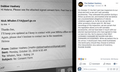 Newfoundland and Labrador Liquor Inspectors visited the shop and told its owners they were unable to sell cannabis accessories as they are not licensed cannabis retailers, the Dabber Hashery said in a Facebook post on October 22. Provincial authorities appeared to contend that the issue was the use of the word “cannabis” in the marketing of those products, citing federal regulation.
