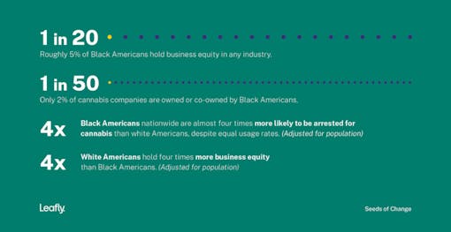 Even though Black people make up 14% of our nation’s population, Leafly’s research found that they only own 2% of cannabis businesses. That disparity is especially glaring in light of data that track black ownership in all industries nationwide. Roughly 1 in 20 Black Americans own business equity in any industry, while only 1 in 50 cannabis companies is Black-owned.