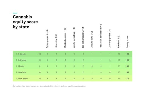 The 2021 report found Colorado and California leading the nation in implementing equity measures in their state cannabis industries. They were followed closely by Illinois and New York. At the low end of the list were Alaska, Maine, Montana, and South Dakota, which lacked the most basic equity measures such as automatic sentence expungement and licensing equity programs.