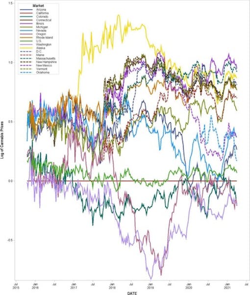 This analysis from economist Barry Goodwin at North Carolina State University focused on cannabis prices across US markets. Goodwin collected data from 15 states with varying degrees of cannabis legislation to see whether the cost of cannabis in one state impacted prices in another. Wholesale weekly price data came from Cannabis Benchmarks, which conducts a national survey of cannabis prices each week.