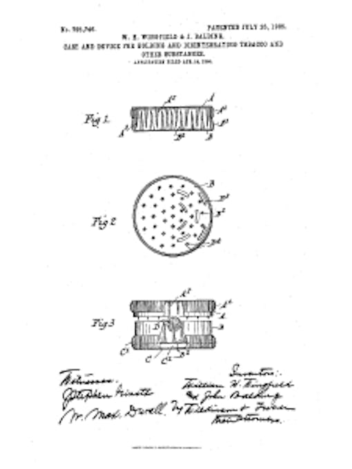 In 1905, a pair of Australian residents were awarded the first US patent for what we now recognize as an “herb grinder.” The invention was designed to be used by tobacco smokers, specifically “to enable plug-tobacco to be disintegrated for pipe-smoking without the use of a common knife.”