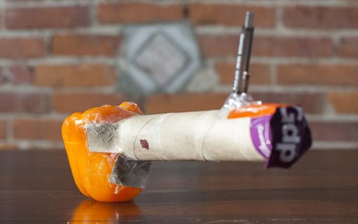 Perhaps Nick had music on his mind when he surveyed the available construction materials, ultimately reaching for a fat bell pepper and a paper towel roll to build something that a flautist could use to jam out a stoned solo. Unfortunately, the pen proved too narrow to draw a satisfying pull, leaving our judges frustratingly clear-headed (although they did concede that Nick’s creation has “got personality in droves” and loved its “character”).