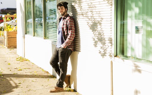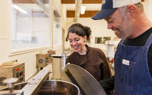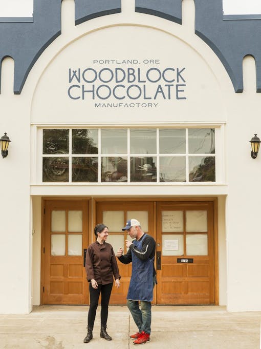 Chocolatiers Holly Hukill and Charley Wheelock chat in front of the Woodblock Chocolate manufactory in Portland, OR. Hukill infuses Woodblock’s chocolate as a part of a special edible collaboration for local dispensary Serra. (Oriana Koren for Leafly)