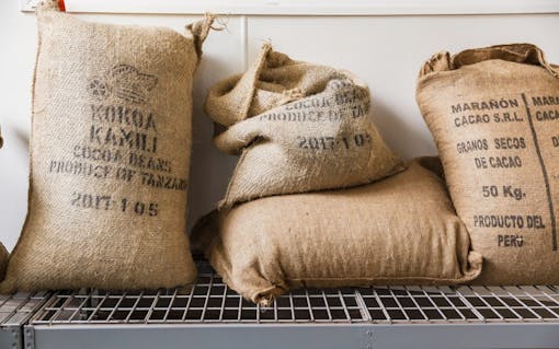 Still life of raw cacao beans waiting to be roasted inside the Woodblock Chocolate manufactory in Portland, OR. (Oriana Koren for Leafly)