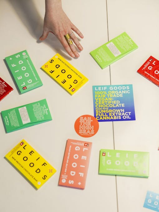 Layflat of all the Leif Goods edible bars. Co-owner Carrie Solomon is principal designer at Leif Goods and uses clean but bright branding to elevate the idea of what a cannabis edible can look and taste like. (Oriana Koren for Leafly)