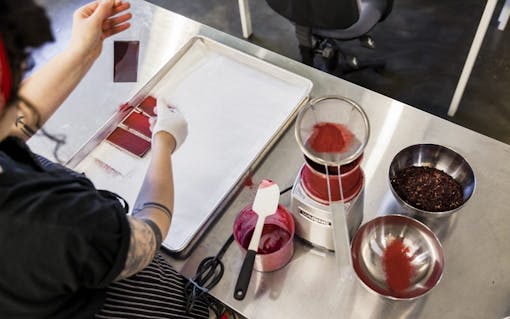One of Leif’s most popular medicated bars is topped with ground hibiscus flower sourced from local teasan, The Jasmine Pearl Tea Company. Leif Goods is focused on creating high-end, food-focused edible chocolate goods while highlighting the culinary talent found in the Portland food scene via collaborations with local coffee roasters, chefs, and others. (Oriana Koren for Leafly)