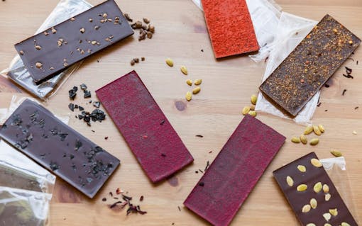 The full lineup of Leif Goods infused chocolate bars: CBD Chocolate Bar with Black Diamond Flake Sea Salt, Mint Hibiscus, Classic Double Chocolate bar, Peanut Butter & Jelly dusted with dried strawberry powder, Limited Edition Sesame Harissa bar dusted with harissa seasoning and the New Mexican chocolate bar with roasted pepitas. (Oriana Koren for Leafly)