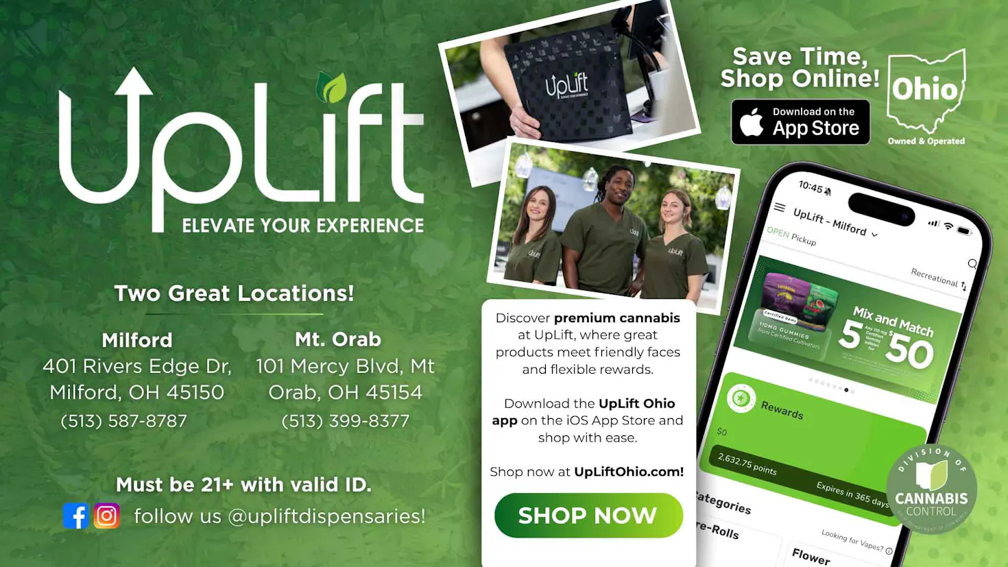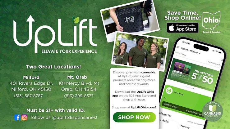 UpLift also takes care of their returning customers through their expansive loyalty rewards program. Repeat UpLift shoppers can earn rewards like merch and non-cannabis accessories, all by just shopping at either of their convenient UpLift locations.