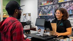 ![Edie Moore (right), executive director of Chicago NORML makes the first purchase on the first day of recreational cannabis sales in Illinois at Mission dispensary in Chicago, Illinois, Jan. 1, 2020. (Taylor Glascock/Leafly File Photo)]()