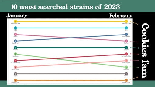 Year after year, Cookies strains and their descendants have been fixtures in Leafly’s most searched strains data. In 2017, GSC and Gelato began charting nationally among all-timers like Blue Dream and Sour Diesel. By 2022, Jealousy and Gary Payton joined the long line of Cookies fam genetics to crack Leafly’s top 10 most searched strains. And right now, a staggering 70% of Leafly’s 10 most searched strains in 2023 can be traced back to Chang’s genetics (the Oreoz strain is also linked to an unknown GSC phenotype, so that number could be even higher).